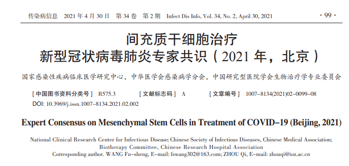 2021年,《傳染病信息)》雜志發表了《間充質干細胞治療新型冠狀病毒肺炎專家共識》,對間充質干細胞治COVID-19提出了建議,包括了患者的選擇、細胞輸注的準備、細胞輸注的監測和不良反應處理、療效評價指標等。