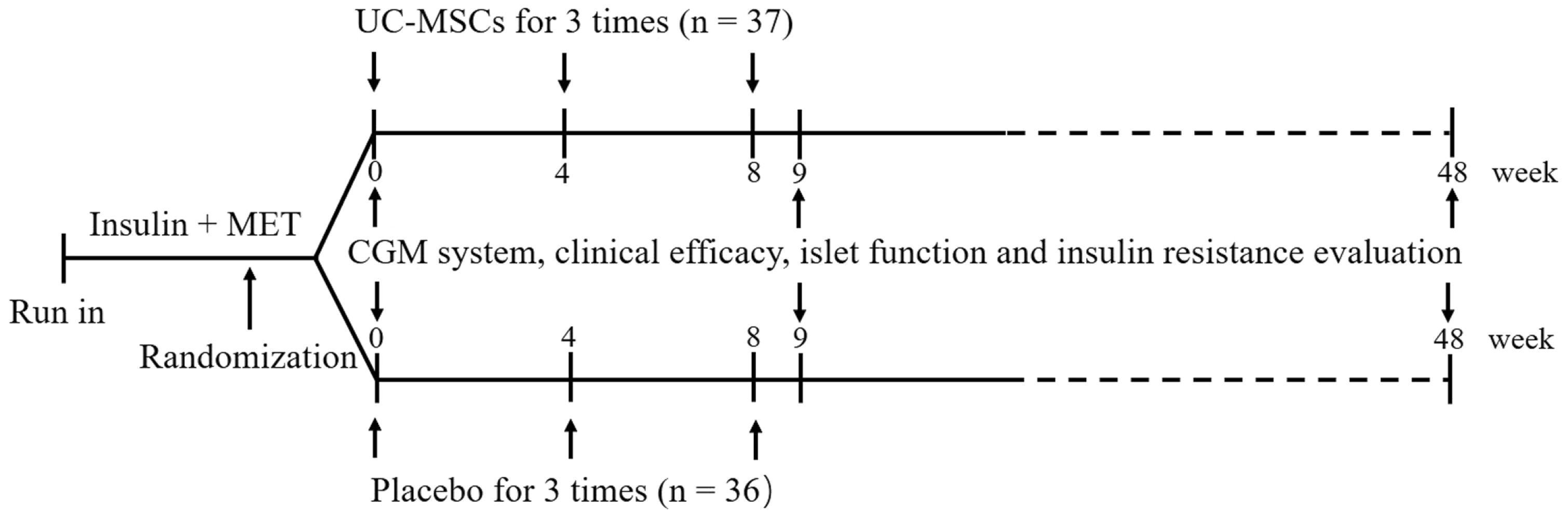 間充質(zhì)干細(xì)胞移植是治療糖尿病的一種有前途的臨床策略,通過促進(jìn)胰島β細(xì)胞功能和減輕胰島素抵抗來改善高血糖。我們之前的前瞻性、單中心、隨機(jī)、雙盲、安慰劑對照試驗(yàn)表明,通過靜脈輸注臍帶間充質(zhì)干細(xì)胞(UC-MSC)是一種安全有效的方法,可以減少外源性胰島素需求并減輕T2D患者的胰島素抵抗。因此,在這項(xiàng)單中心、雙盲、隨機(jī)、安慰劑對照試驗(yàn)中,我們使用連續(xù)血糖監(jiān)測來研究臍帶間充質(zhì)干細(xì)胞對中國成人2型糖尿病的療效。