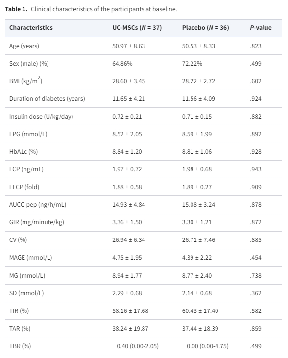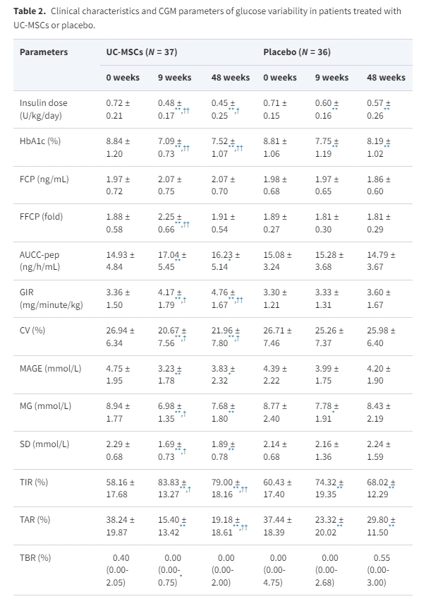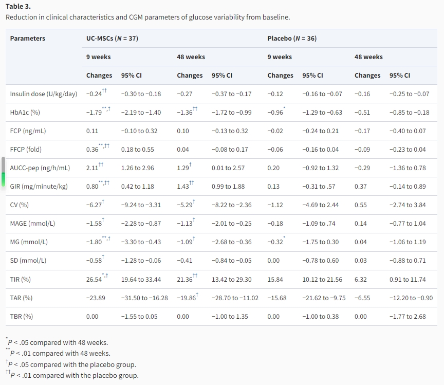 這項(xiàng)前瞻性、單中心、隨機(jī)、雙盲、安慰劑對照試驗(yàn)證明,通過靜脈輸注臍帶間充質(zhì)干細(xì)胞可有效改善TIR和血糖變異性。