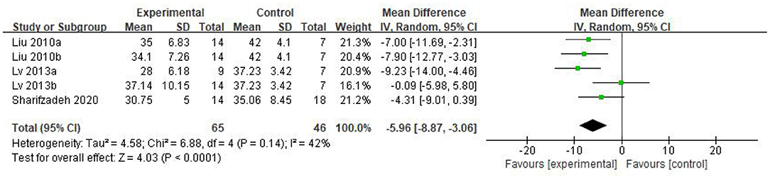 從圖4的森林圖可以看出,異質性檢驗p=0.14;I2=42%,表明中度異質性。數據顯示,干細胞組的CARS評分顯著低于對照組[WMD:-5.96;95%CI(-8.87,-3.06);p<0.0001](圖4)。CARS得分越高表示疾病嚴重。