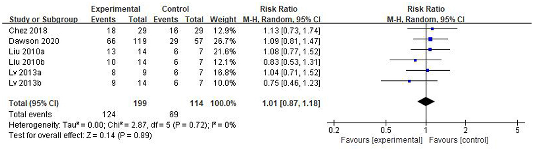 結果:符合納入標準的5項研究被納入當前分析。使用康復治療作為參考標準進行薈萃分析。數據顯示,干細胞組的兒童自閉癥評定量表得分顯著低于對照組(WMD:-5.96;95%CI [-8.87,-3.06];p?< 0.0001)。Clinical Global Impression評分綜合效應量RR=1.01, 95%CI [0.87, 1.18], Z=0.14 (?p=0.89),Clinical Global Impression的有效率在干細胞組分別為62%和60%,分別為對照組。各組不良反應發生事件(RR=1.55;95%CI=0.60~3.98;p=0.36),干細胞組與對照組的不良反應發生率無顯著差異