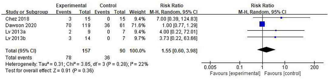 圖6中的森林圖反映了各組不良反應的發生事件[RR=1.55;95%CI = (0.60, 3.98); p=0.36; 圖6],干細胞組與對照組的不良反應發生率無顯著差異,異質性檢驗p=0.28;我2=22%。基于森林地圖,我們有視覺異常值。敏感性分析發現,道森等人的研究是一個異常值,是異質性的原因。而排除Dawson等人的研究后,結果更穩定 [RR=4.70;95%CI= (0.90, 24.63); p=0.07;異質性檢驗p= 0.95; 我2=0%]。