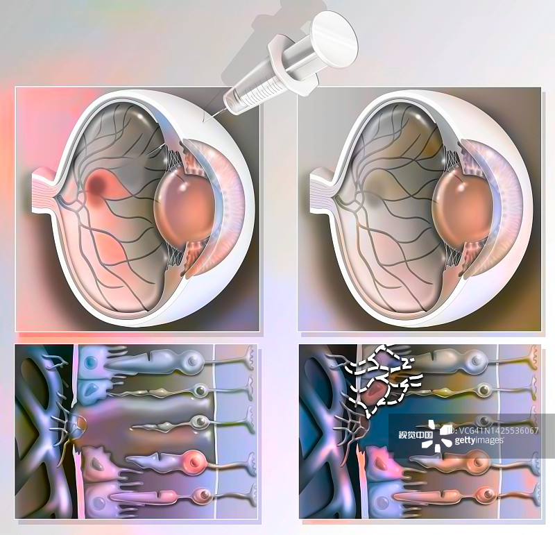 濕性AMD:對(duì)于濕性AMD,醫(yī)生使用藥物治療和手術(shù)技術(shù)來幫助保持現(xiàn)有視力。目前的一線治療是向患眼注射藥物以抑制新血管的形成。這些藥物會(huì)阻止血管內(nèi)皮生長(zhǎng)因子或VEGF的產(chǎn)生,VEGF會(huì)向身體發(fā)出信號(hào)以制造新血管。對(duì)于許多人來說,需要每四到六周重復(fù)注射一次。