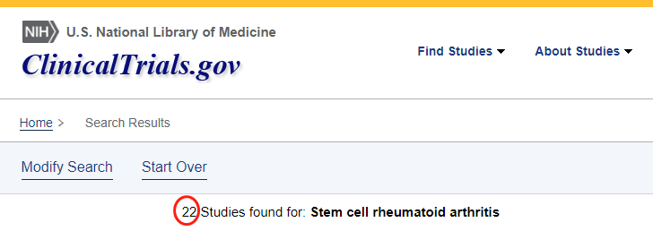 截止2023年1,在美國國立衛生研究院的最大臨床試驗注冊庫clinicaltrials.gov網站上注冊的有關干細胞治療類風濕關節炎的臨床研究項目有22項。
