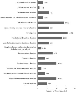 根據嚴重程度、嚴重性和與研究治療的關系分類的AE。共報告了113起。