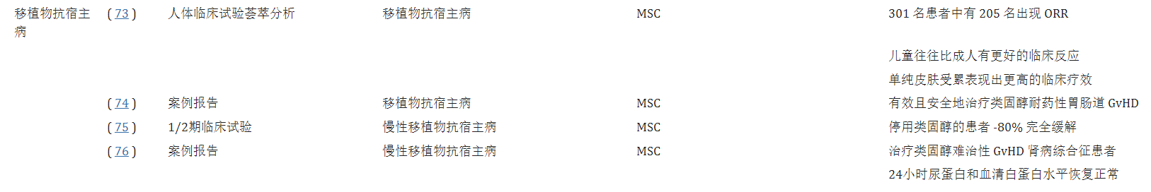 間充質(zhì)干細(xì)胞治療移植物抗宿主病:一項(xiàng)關(guān)注MSC治療類固醇難治性aGvHD療效的薈萃分析報(bào)告稱,301名患者中有205名表現(xiàn)出總體緩解率 (ORR)。作者表示,與胃腸道和肝臟受累的患者相比,單純皮膚受累的患者表現(xiàn)出更高的臨床療效。此外,兒童往往比成人有更好的臨床反應(yīng)。
