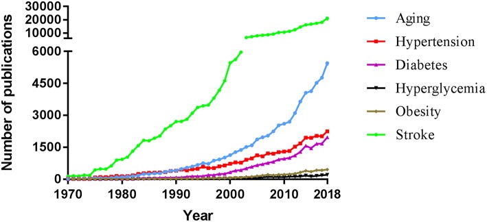 2018年12月在PubMed中進(jìn)行了高級(jí)搜索,查找每年出版的所有使用文本單詞“筆劃”且給定術(shù)語作為文本單詞的文章:“年齡”或“老化”;高血壓或高血壓或高血壓;糖尿病或糖尿病;高血糖或高血糖或高血糖或高血糖水平;或肥胖或超重。考慮了英語(而不是其他語言)文章的最終出版年份(而不是提前的在線日期)。