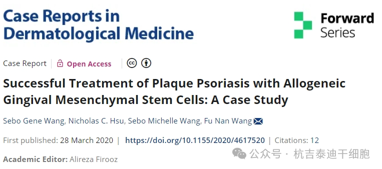 美國加州洛馬林達大學醫學院的團隊在行業期刊Case Rep Dermatol Med 上發表了題為Successful Treatment of Plaque Psoriasis with Allogeneic Gingival Mesenchymal Stem Cells: A Case Study(間充質干細胞成功治療斑塊性銀屑?。喊咐芯浚ㄏ聢D)。