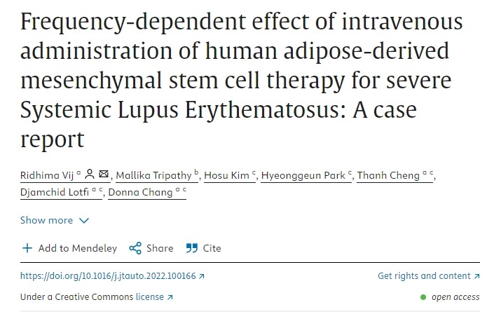 【4】Ridhima Vij, Mallika Tripathy, Hosu Kim, Hyeonggeun Park, Thanh Cheng, Djamchid Lotfi, Donna Chang,Frequency-dependent effect of intravenous administration of human adipose-derived mesenchymal stem cell therapy for severe Systemic Lupus Erythematosus: A case report,