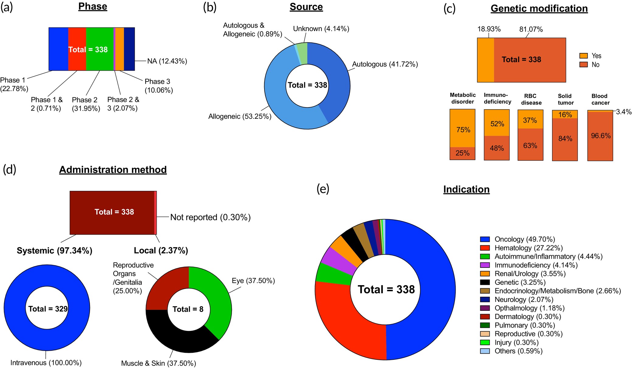 對346項MSC臨床試驗進行了分析,并根據以下標準進行了分類:(a) 試驗階段;(b) 細胞來源;(c) 給藥方法,進一步分為全身和局部途徑;(d) 適應癥類型。不適用 (NA)。