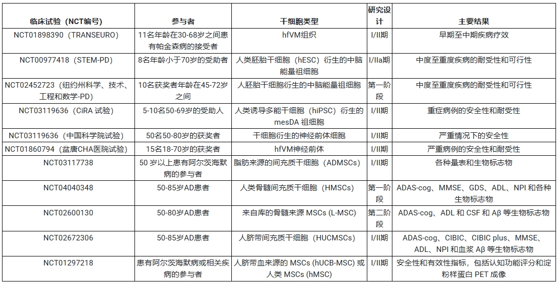 表2中的臨床研究旨在探索各種干細胞移植技術,針對不同階段和嚴重程度的帕金森病和阿爾茨海默癥(AD)進行治療。