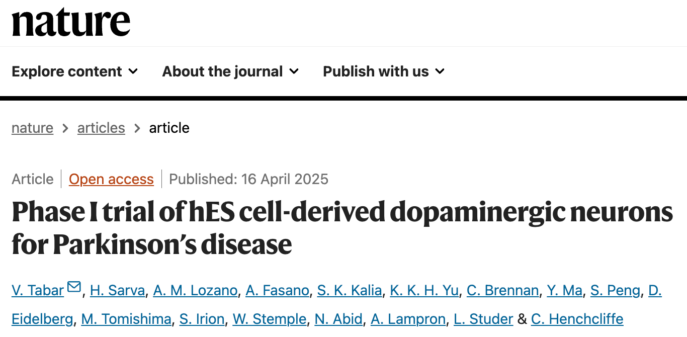 2025年4月16日,國際頂尖學術期刊Nature上發表了兩項獨立的臨床試驗論文,這兩項研究分別探索了基于人誘導多能干細胞(hiPSC)和人類胚胎干細胞(hES)的細胞療法,顯示出了對帕金森病患者的安全性,并顯示出了初步療效,這兩項研究是朝著更廣泛地使用細胞療法進行帕金森病治療邁出了重要一步。