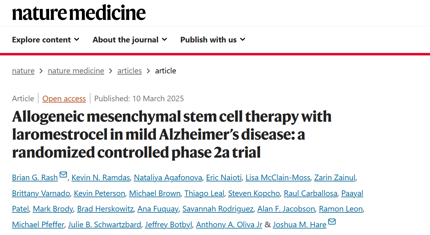 2025年3月10日,美國邁阿密大學米勒醫學院跨學科干細胞研究所、美國佛羅里達州德拉海灘腦問題研究中心等研究團隊在行業期刊《自然醫學》(Nature Medicine)上發表了題為Allogeneic mesenchymal stem cell therapy with laromestrocel in mild Alzheimer’s disease: a randomized controlled phase 2a trial(同種異體間充質干細胞與 laromestrocel 治療輕度阿爾茨海默病:一項隨機對照2a期試驗)的研究成果。