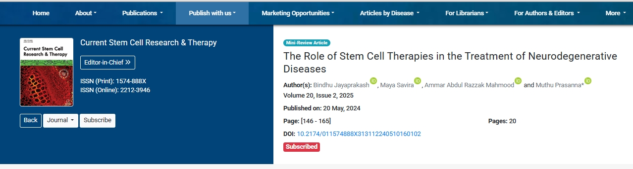 近期,期刊雜志《Current Stem Cell Research & Therapy》發表了一篇“The Role of Stem Cell Therapies in the Treatment of Neurodegenerative Diseases”的文章[1]。