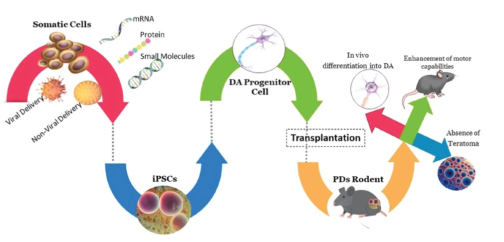 在圖 (1) 中的PsD大鼠模型。胚胎干細胞 (ESC) 和誘導性多能干細胞 (iPSC) 是引導細胞向多巴胺能方向分化并在實驗室環境下產生大量多巴胺能神經元的最佳選擇。此外,胎兒腦中的神經干細胞 (NSC) 也為醫學治療的實際應用提供了廣闊的前景。iPSC衍生和直接轉化的多巴胺能神經元均具有可移植回帕金森病患者自身細胞的優勢。