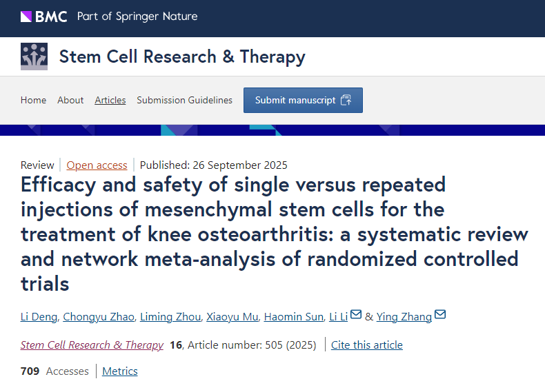 [12]Deng, L., Zhao, C., Zhou, L. et al. Efficacy and safety of single versus repeated injections of mesenchymal stem cells for the treatment of knee osteoarthritis: a systematic review and network meta-analysis of randomized controlled trials. Stem Cell Res Ther 16, 505 (2025). https://doi.org/10.1186/s13287-025-04638-2