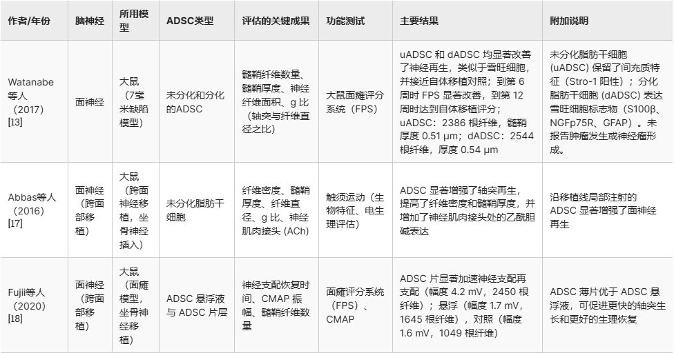 通過分析12篇相關研究(盡管主要為動物實驗),發現無論是ADSC還是dADSC治療,均顯示出改善神經再生、促進髓鞘形成、恢復肌肉神經支配以及增強腦神經功能的潛力。這些初步結果表明,ADSC在腦神經損傷修復中可能扮演著重要角色。