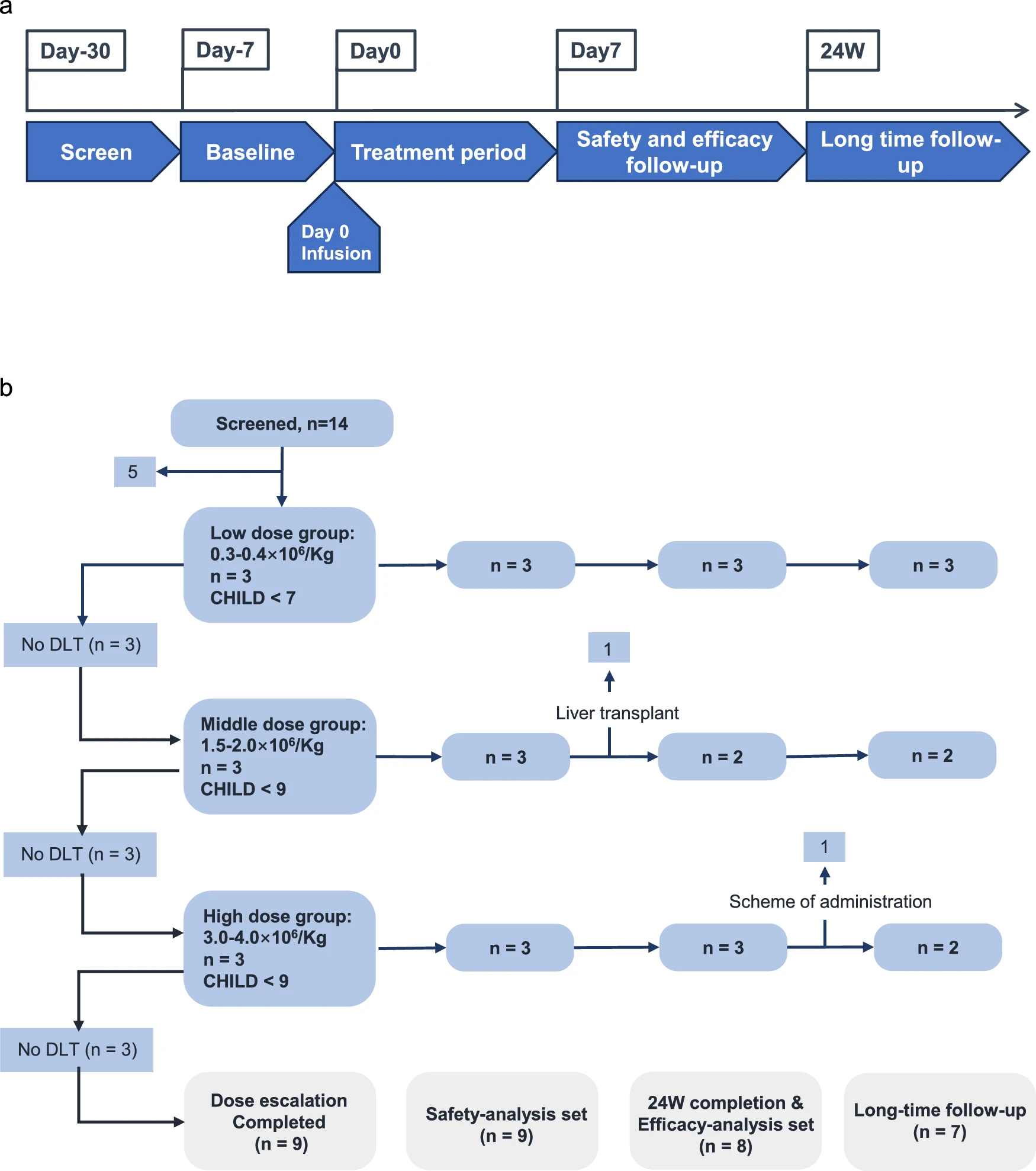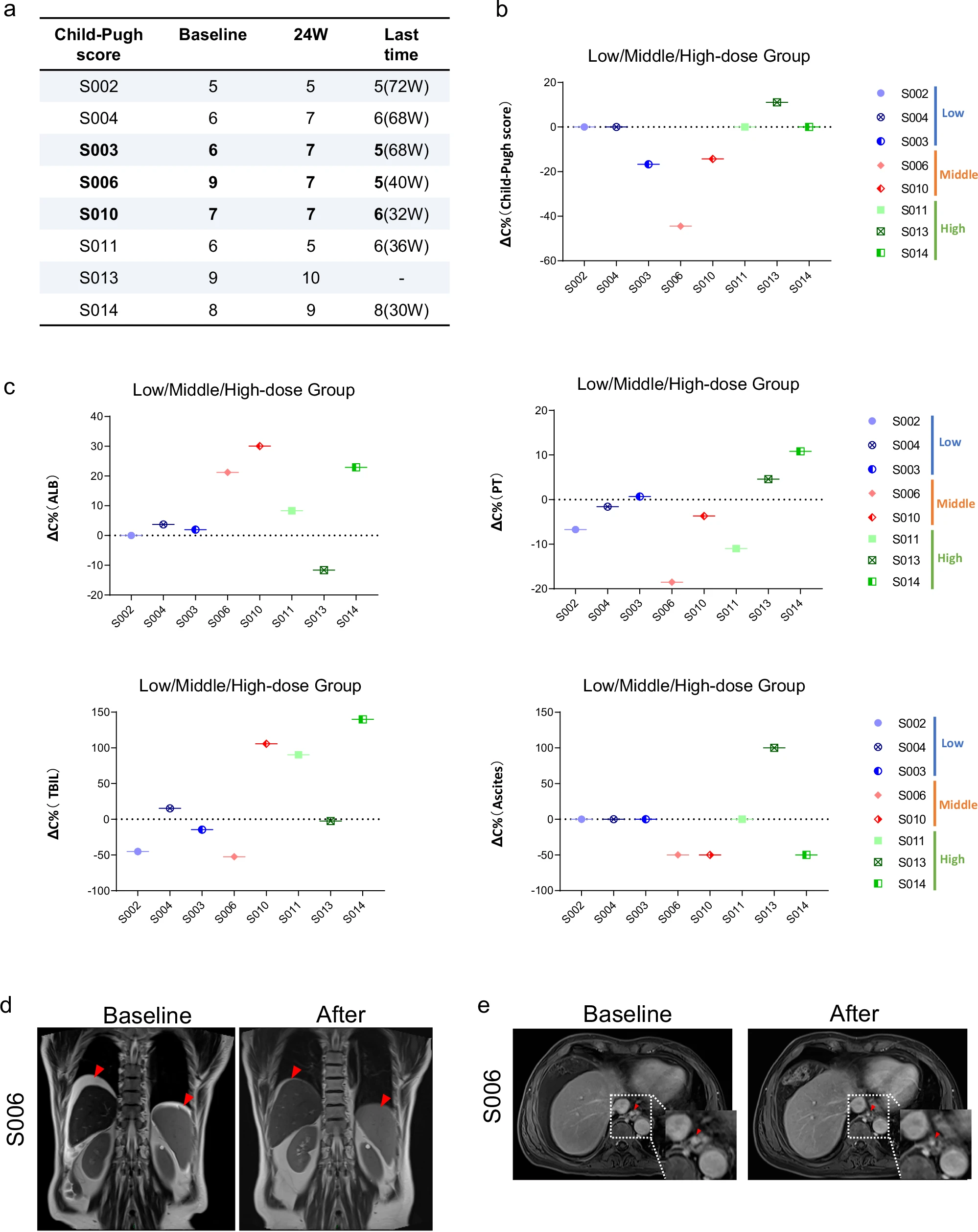 該研究在2021年12月27日至2022年12月14日期間,共招募并篩選了14例病因各異的肝硬化患者。其中9例患者接受了經肝動脈輸注HepLPCs的治療,劑量遞增:低劑量組(0.3–0.4×10?/kg)、中劑量組(1.5–2.0×10?/kg)和高劑量組(3.0–4.0×10?/kg)(圖4、5a)。