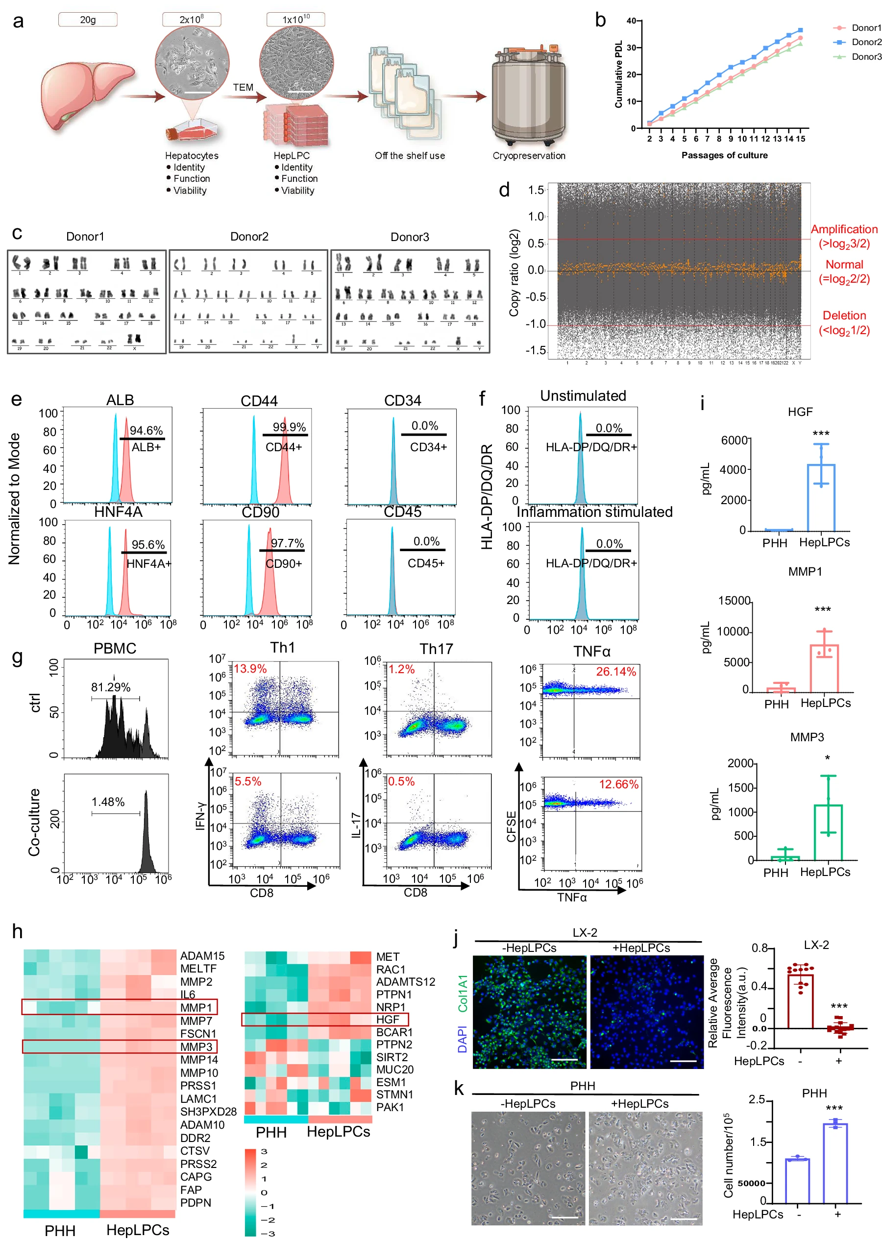 細胞特性與安全性驗證:核型分析和全基因組測序證實了細胞的基因組穩定性。流式細胞術分析顯示,HepLPCs同時表達肝臟特異性基因與干細胞/祖細胞基因,且不表達MHC II類抗原,具備低免疫原性。