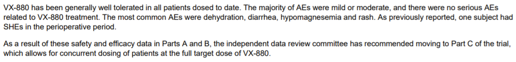 安全性:VX-880的副作用主要是輕度至重度,沒有發生嚴重副作用。VX-880治療表現出良好的安全性,且耐受性良好。大多數不良事件為輕度或中度,未發現與VX-880治療相關的嚴重不良事件。