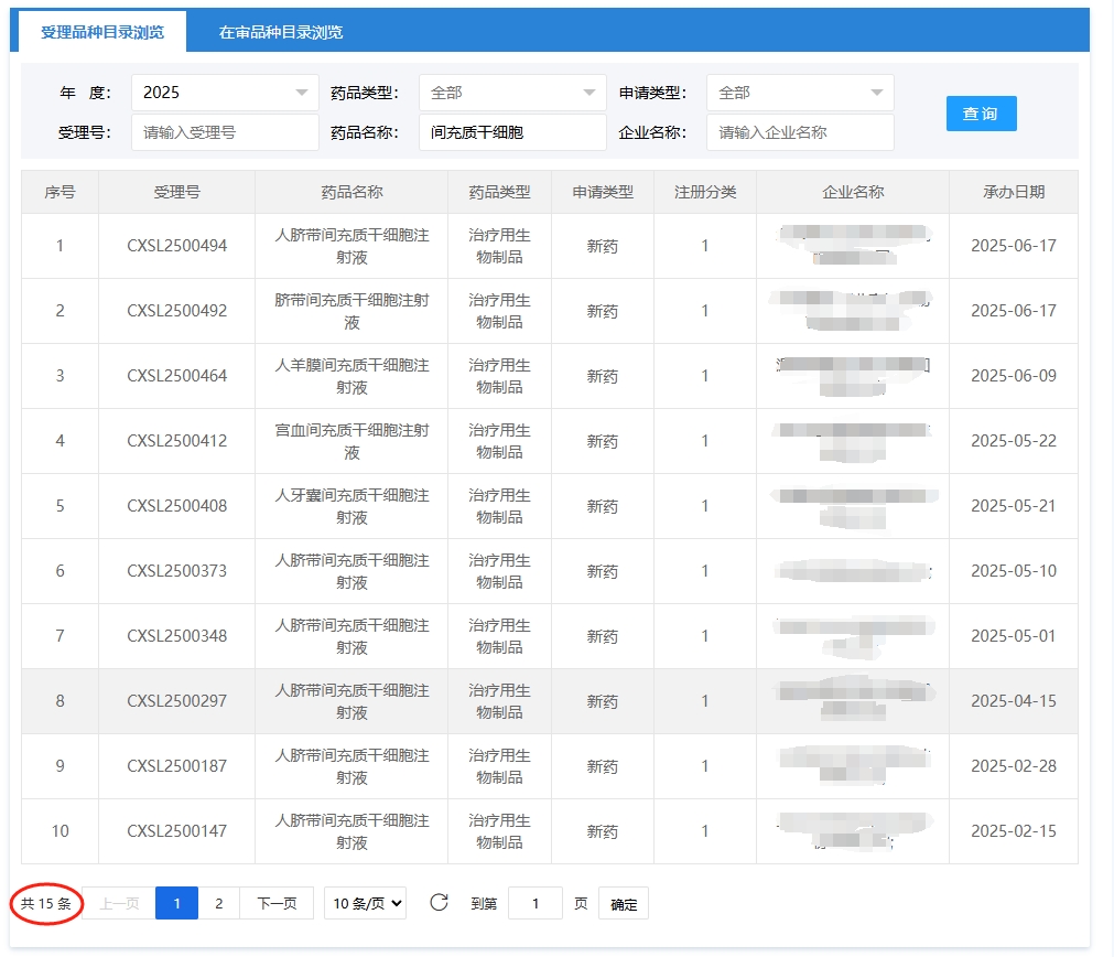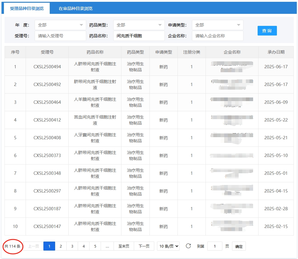 截至2025年1月15日,我們通過在國家藥品監督管理局藥品審評中心-信息公開-受理品種信息欄目通過關鍵詞“間充質干細胞”搜索查詢受理的間充質干細胞新藥有114項,其中25年1-5月新增12項