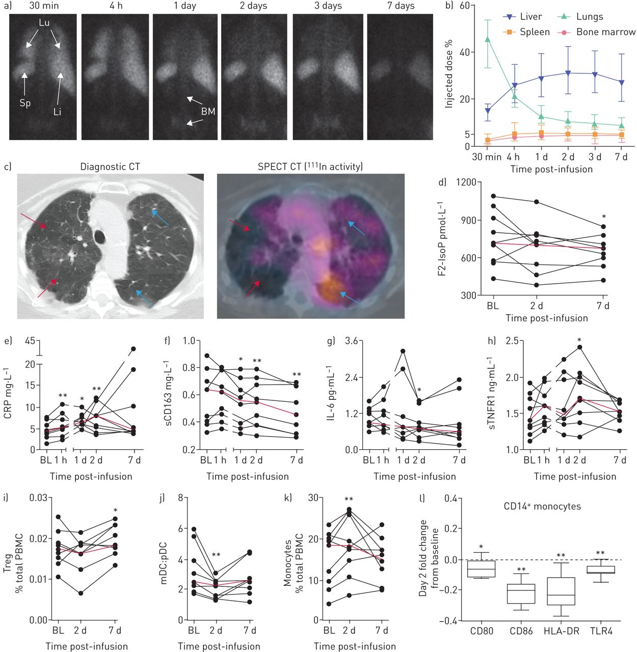 輸注后 7 天內,銦-111 存在于肺 (Lu) 中,其次是肝臟 (Li)、脾臟 (Sp) 和骨髓 (BM) (a)
