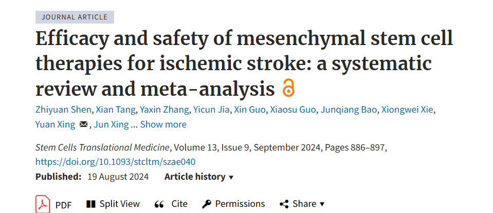 參考資料:Zhiyuan Shen, Xian Tang, Yaxin Zhang, Yicun Jia, Xin Guo, Xiaosu Guo, Junqiang Bao, Xiongwei Xie, Yuan Xing, Jun Xing, Shujuan Tian, ??Efficacy and safety of mesenchymal stem cells in the treatment of ischemic stroke: a systematic review and meta-analysis-analysis, Stem Cell Translational Medicine, Volume 13, Issue 9, September 2024, Pages 886–897, https://doi.org/10.1093/stcltm/szae040