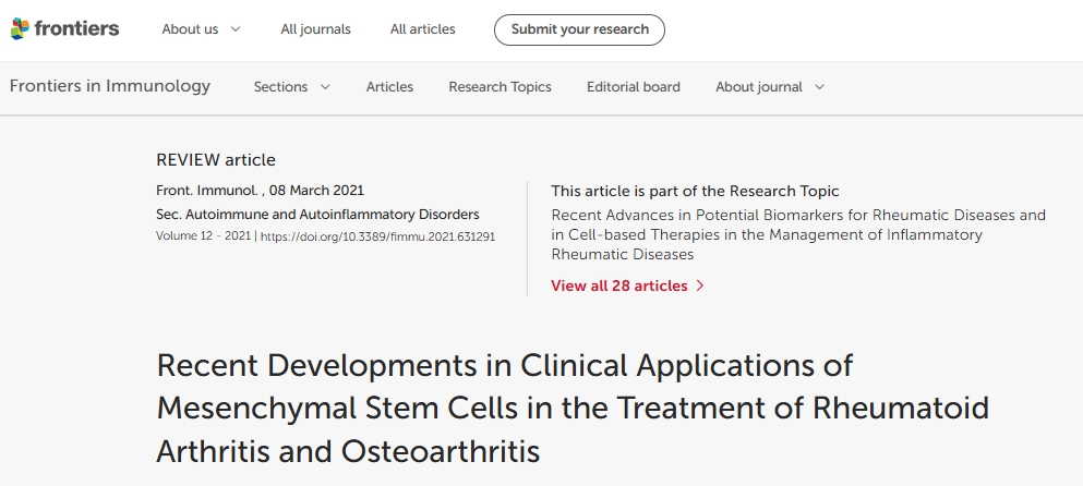 2019年,空軍第九八六醫院(西京醫院九八六醫院)、澳門大學健康科學學院研究團隊在行業期刊《Drug Des Devel Ther.》上發表了題為《Efficacy and Safety of Umbilical Cord Mesenchymal Stem Cell Therapy for Rheumatoid Arthritis Patients: A Prospective Phase I/II Study(臍帶間充質干細胞治療類風濕性關節炎患者的療效和安全性:一項前瞻性I/II期研究)的臨床研究成果。