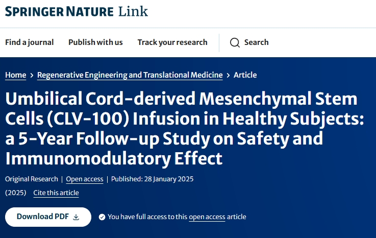 近日,國際醫(yī)學期刊雜志《Regenerative Engineering and Translational Medicine》發(fā)表了一篇“臍帶間充質干細胞(CLV-100)輸注于健康受試者:安全性和免疫調節(jié)效果的5年隨訪研究”的臨床試驗文章[1]。