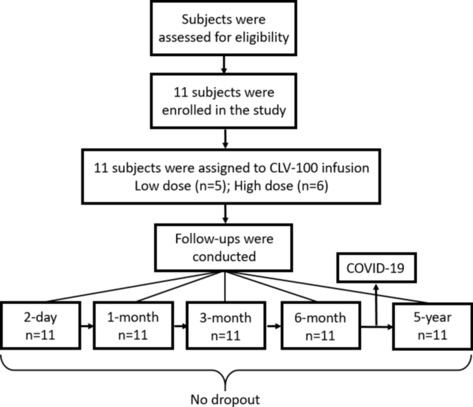 臨床測量指標:主要結局指標為確定CLV-100輸注的中期安全性(臨床和亞臨床結局),重點關注死亡、住院、相關不良事件和癌癥。次要結局指標包括基于亞臨床血清炎癥細胞因子評估的免疫調節(jié)作用。