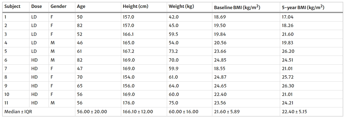 表1:低劑量組(LD)和高劑量組(HD)5年隨訪期間的體格測量數(shù)據(jù)