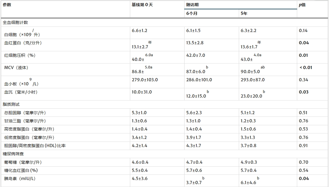 所有受試者5年隨訪時的實驗室檢查結果均在正常參考范圍內(表3)。與基線測量值相比,血紅蛋白、紅細胞壓積 (HCT) 和平均紅細胞體積 (MCV) 均顯著增加。5年隨訪時的紅細胞沉降率 (ESR) 也顯著高于6個月隨訪時的水平。由于ESR通常隨年齡增長而升高,因此這種升高是可以預料的,而本組受試者(中位年齡56.0歲)的ESR值保持在正常范圍內(< 30 mm/h)。