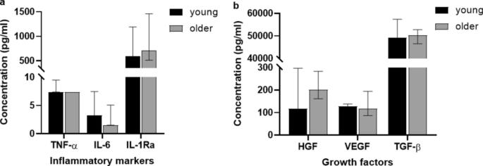 圖6:5年隨訪期間,年輕受試者(<60歲;n?=6)和年長受試者(>60歲;n=5)的炎癥標志物(a)和生長因子(b)水平。