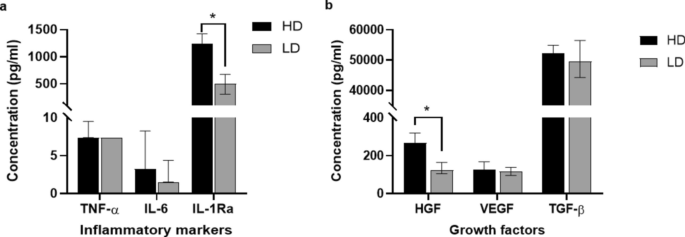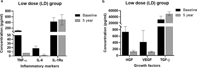 圖5:低劑量組(LD;n=5)和高劑量組(HD;n?=6)在5年隨訪期間的炎癥標志物(a)和生長因子(b)水平。