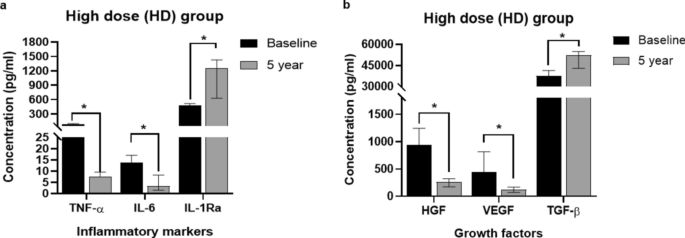 圖3:高劑量(HD;n=6)組炎癥標志物(a)和生長因子(b)水平在基線和5年隨訪期間的比較。