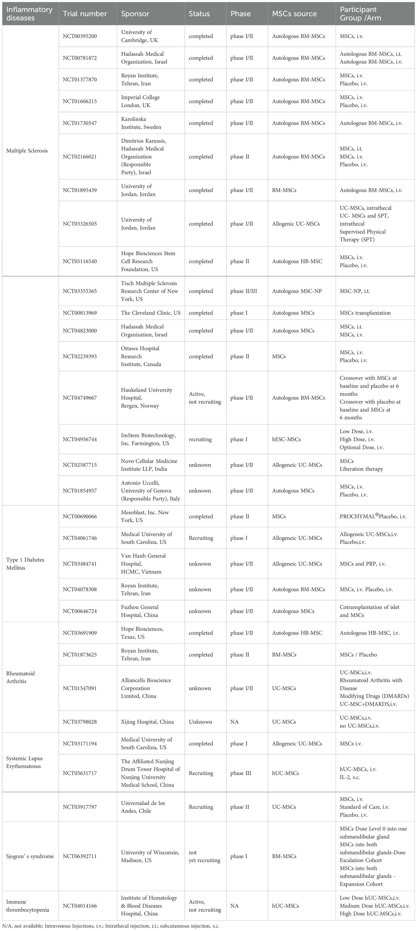 我們?cè)诒?中總結(jié)了MSCs在治療自身免疫性疾病方面已完成和正在進(jìn)行的臨床試驗(yàn)。這些注冊(cè)研究的結(jié)果均證明了MSCs在治療自身免疫性疾病方面的安全性和有效性。