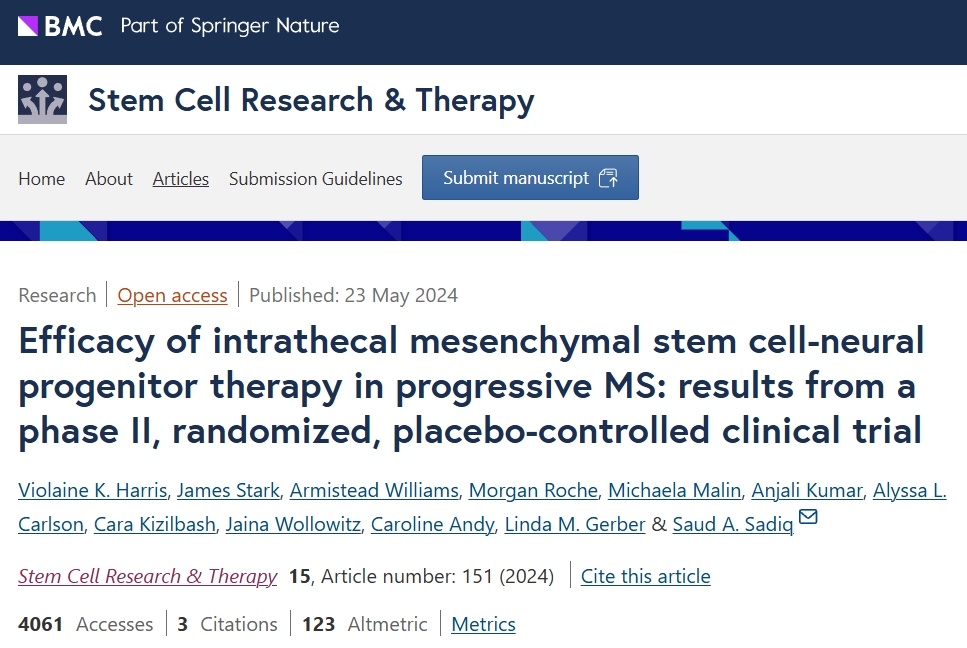 2024年,國(guó)際期刊雜志《干細(xì)胞研究與治療》發(fā)表了一篇“鞘內(nèi)間充質(zhì)干細(xì)胞-神經(jīng)祖細(xì)胞治療進(jìn)展型多發(fā)性硬化癥的療效:II期隨機(jī)安慰劑對(duì)照臨床試驗(yàn)結(jié)”的文章。