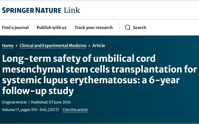 2016年,國(guó)際期刊雜志《臨床與實(shí)驗(yàn)醫(yī)學(xué)》發(fā)表了一篇“臍帶間充質(zhì)干細(xì)胞移植治療系統(tǒng)性紅斑狼瘡的長(zhǎng)期安全性:6年隨訪研究”的文章。