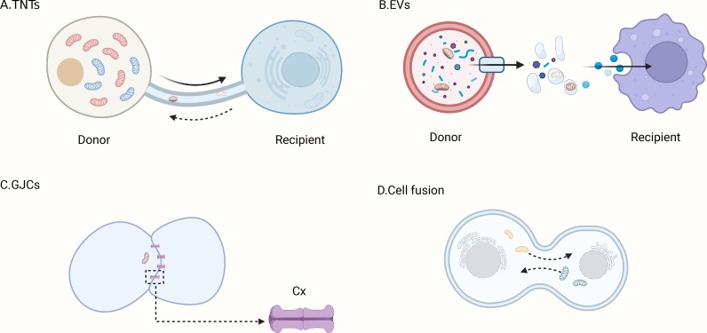 A. TNT 是一種膜狀管狀突起,從質(zhì)膜延伸出來,連接兩個(gè)細(xì)胞形成開放通道。TNT 是連接細(xì)胞之間 MT 最常見的路徑。B. 據(jù)報(bào)道,由細(xì)胞質(zhì)膜起泡形成的 EVs 是 MT 的另一種路徑。C. GJC 介導(dǎo)的 MT 模式尚不明確。可能的機(jī)制是供體細(xì)胞的突起中存在線粒體,受體細(xì)胞通過內(nèi)陷 JCs 連接到供體細(xì)胞。然后,受體細(xì)胞內(nèi)化 JCs 并吸收線粒體。D. 細(xì)胞融合共享細(xì)胞質(zhì)成分和細(xì)胞器,包括線粒體。