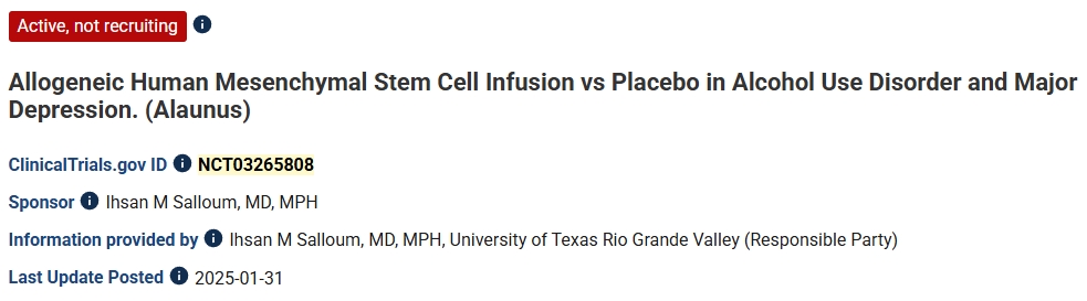 第三項:2025年,美國德克薩斯大學里奧格蘭德河谷分校進行了一項同種異體人間充質(zhì)干細胞輸注與安慰劑在酒精使用障礙和重度抑郁癥中的療效對比的臨床研究。