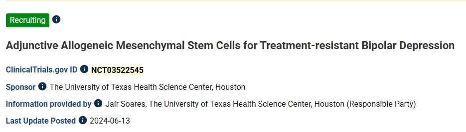 第二項:2024年,美國德克薩斯大學休斯頓健康科學中心開展了一項輔助性異基因間充質(zhì)干細胞治療難治性雙相抑郁的臨床研究。