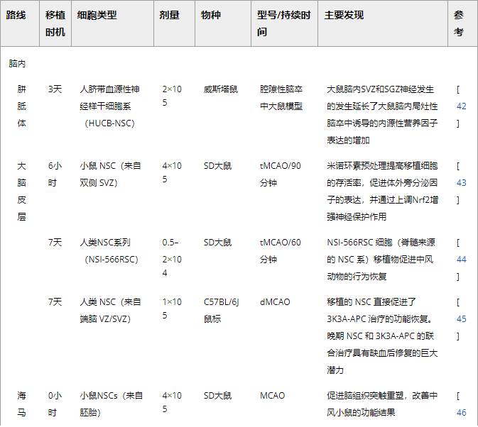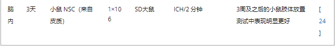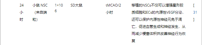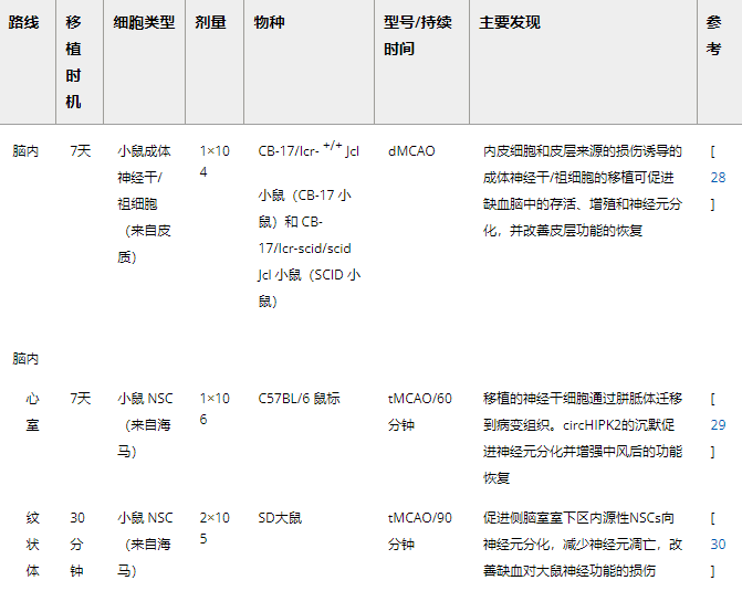 表2:腦內(心室和紋狀體)NSC移植治療腦缺血的代表性實驗研究。