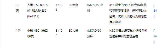 表1:靜脈和動脈NSC移植治療腦缺血的代表性實驗研究。