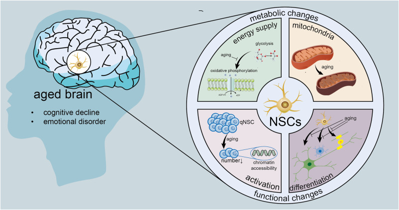 在老年大腦中,海馬NSC會發(fā)生一些與認知衰退和情緒障礙相關(guān)的變化:1)衰老阻礙了 qNSC 激活期間代謝模式的轉(zhuǎn)變,從而影響神經(jīng)發(fā)生的能量供應(yīng)。2)線粒體動力學在衰老過程中發(fā)生變化,最終導致認知衰退和情緒障礙。3)在衰老過程中,qNSC的數(shù)量和功能下降,這可能與染色質(zhì)可及性的改變有關(guān)。4)衰老會損害成人海馬神經(jīng)發(fā)生(AHN),并阻止NSC分化為神經(jīng)元和神經(jīng)膠質(zhì)細胞。