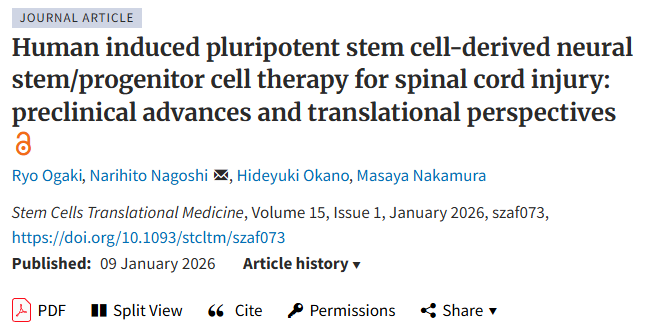 主要參考資料:[1]:Ryo Ogaki, Narihito Nagoshi, Hideyuki Okano, Masaya Nakamura, Human induced pluripotent stem cell-derived neural stem/progenitor cell therapy for spinal cord injury: preclinical advances and translational perspectives,?Stem Cells Translational Medicine, Volume 15, Issue 1, January 2026, szaf073,?https://doi.org/10.1093/stcltm/szaf073