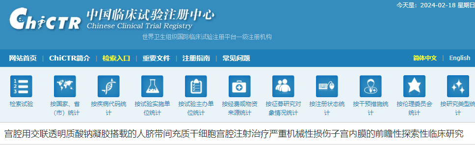據悉,該項研究注冊號為ChiCTR2400080588,注冊日期為2024年2月1日,旨在評估宮腔用交聯透明質酸鈉凝膠搭載的人臍帶間充質干細胞宮腔移植治療對中重度宮腔粘連及薄型內膜患者的有效性和安全性。