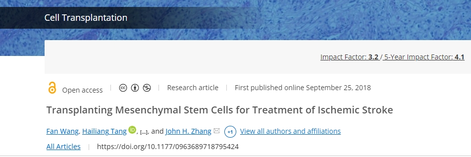 2018年9月25日復旦大學華山醫院在國際期刊《Cell Transplantation》上發表了一篇關于Transplanting Mesenchymal Stem Cells for Treatment of Ischemic Stroke(移植間充質干細胞治療缺血性中風)的文章。