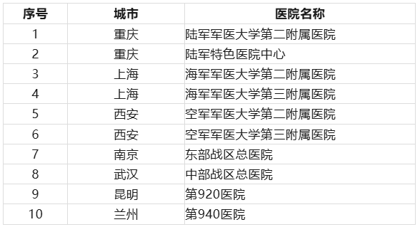 | 13 | 重慶 | 陸軍軍醫大學第二附屬醫院 |