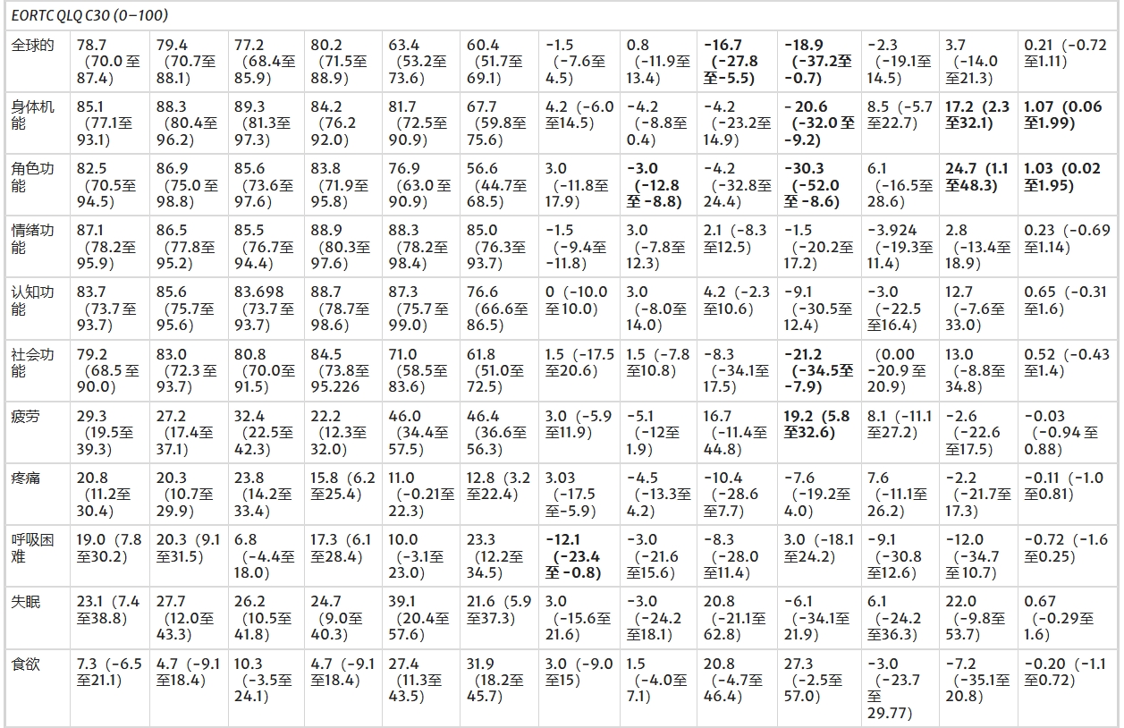 在T2期,實驗組在EORTC-QLQ C30量表的身體功能和角色功能子量表上顯示出顯著優于對照組的組間差異。其他次要結局未達到統計學顯著。然而,T2期實驗組在以下方面表現出中到大效應優勢:體重增加、認知功能改善、社會功能、區分生活中重要事項的能力,以及呼吸困難減輕和胃腸道癥狀緩解。