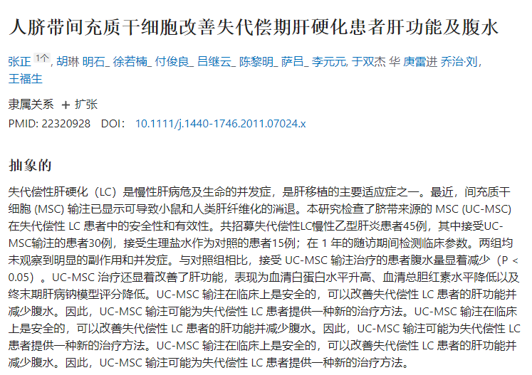 2012年,Shi等進(jìn)行了一項(xiàng)病例對(duì)照研究,以評(píng)估UC-MSC移植治療慢加急性肝衰竭 (ACLF) 的CHB患者的安全性和有效性;并發(fā)現(xiàn)存活率增加,伴隨著終末期肝病評(píng)分降低和肝功能增強(qiáng)。